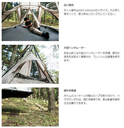 ○ セット内容:本体、インナーウォール、ボトムシート、ボトムフレーム一式、ルーフフレーム、吊り下げテープ長・短、コネクター(×2)、自在付ロープ(1.2m×4)、保護シート(×2)、ジュラルミンペグ(×4)、フレームケース、ペグ・テープケース、キャリーバッグ